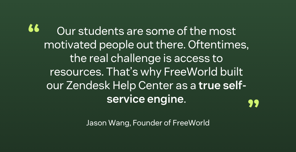 “For a lot of our Free Agents, their challenges aren’t because they don’t have drive or motivation. We find that our students are some of the most motivated people out there. Oftentimes, the real challenge is lack of access to resources, especially, resources that are understandable,” said Wang. “That’s why FreeWorld built our Zendesk Help Center as a true self-service engine, with materials designed by people with lived experience who know precisely what questions arise and when.”