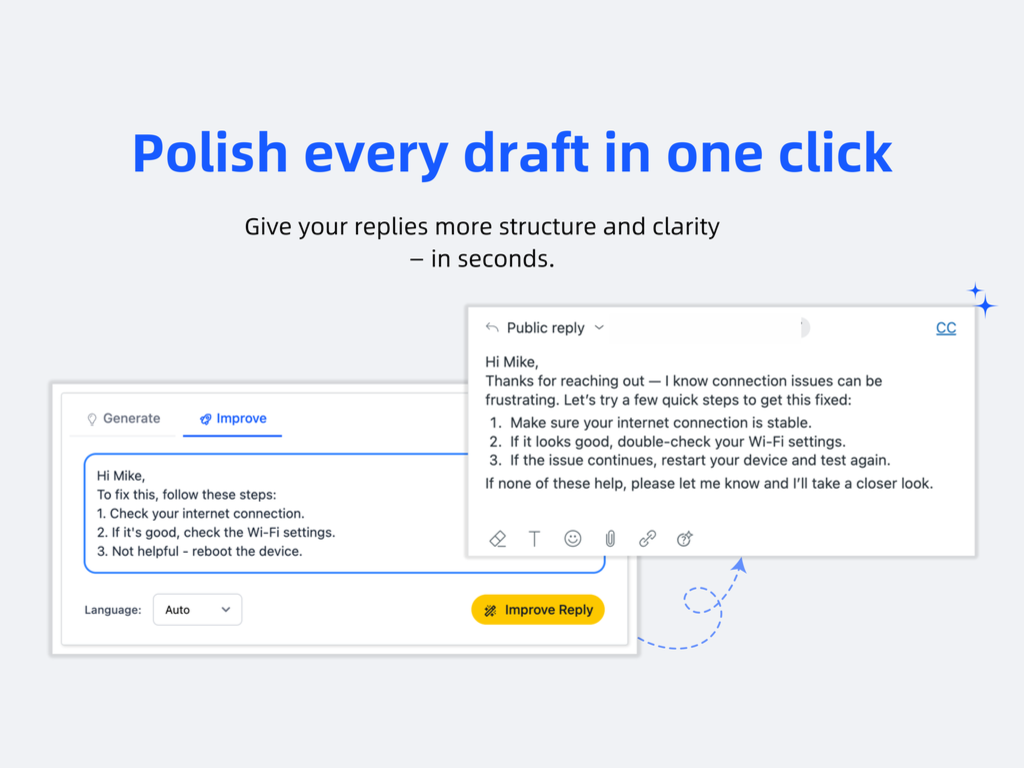 Empower your support team to respond faster, maintain tone consistency, and spend time where it matters most.