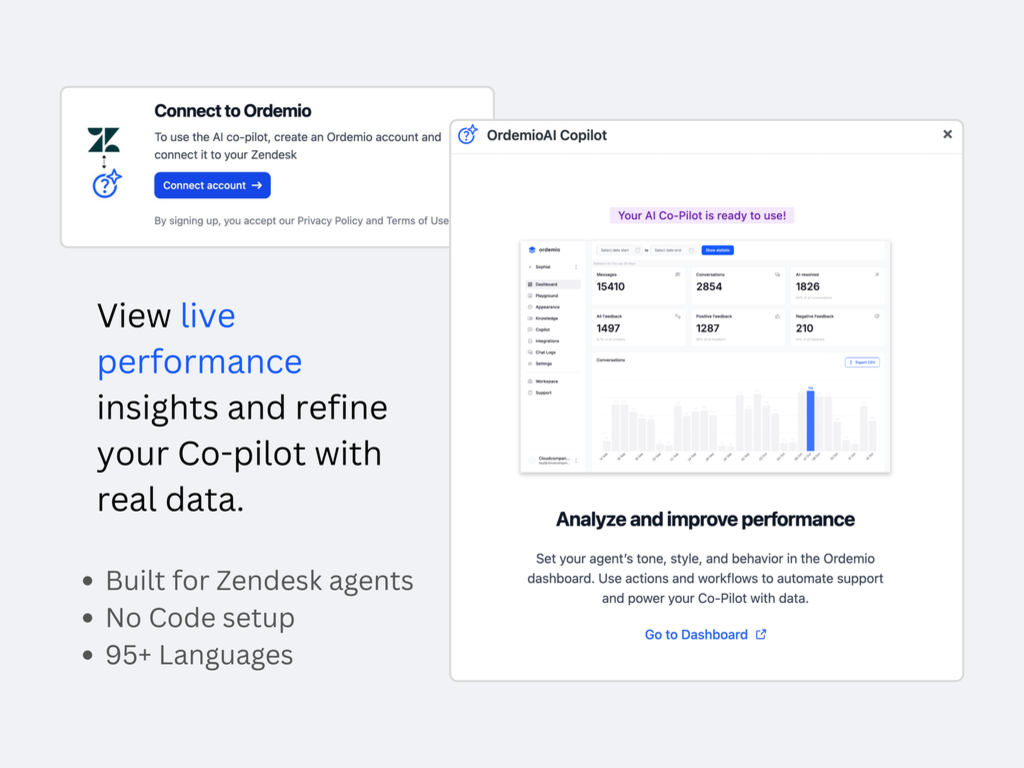 The Ordemio ChatGPT agent co-pilot drafts, improves, and personalizes responses directly in your ticket composer — no tab-switching, no extra tools.