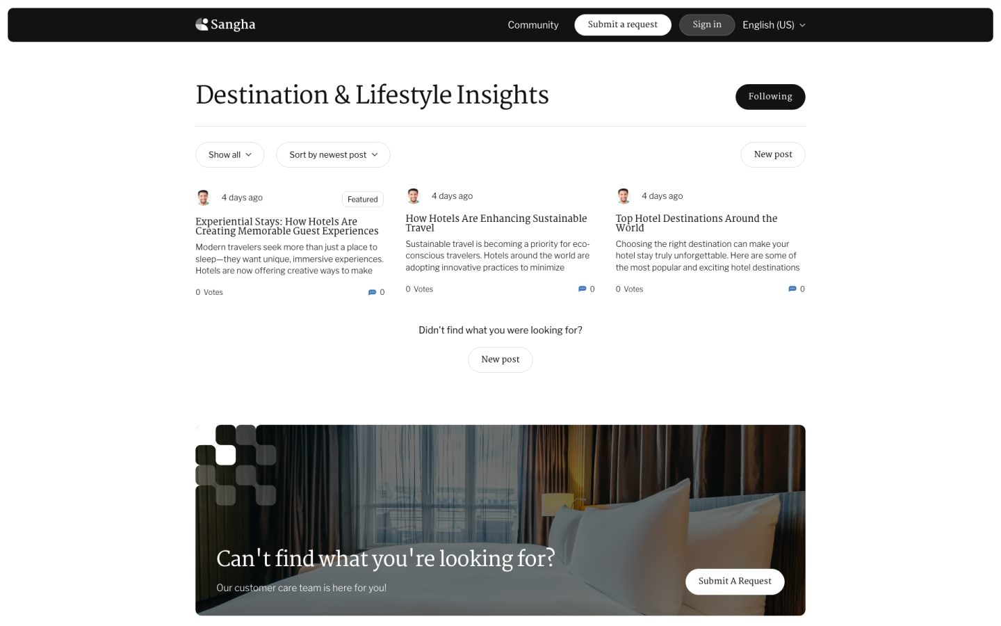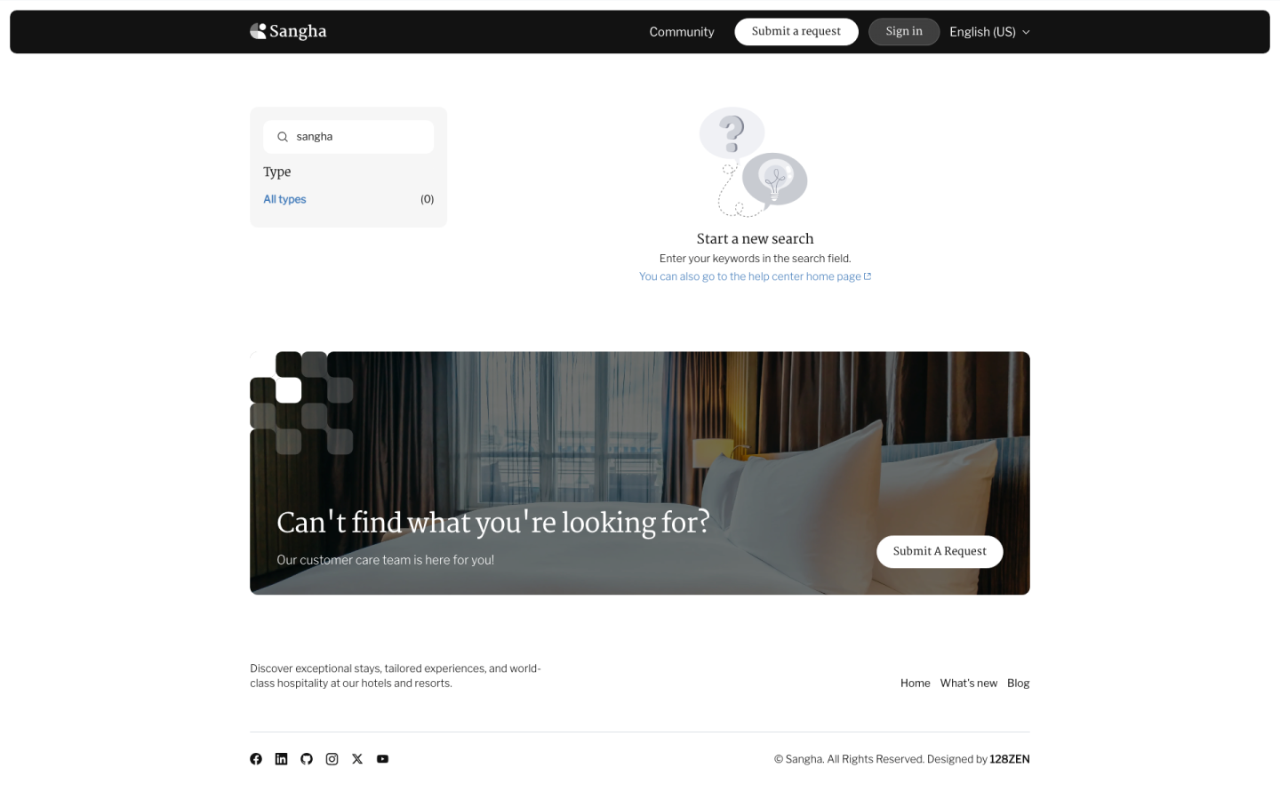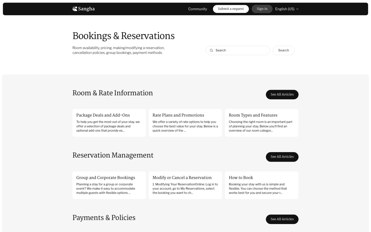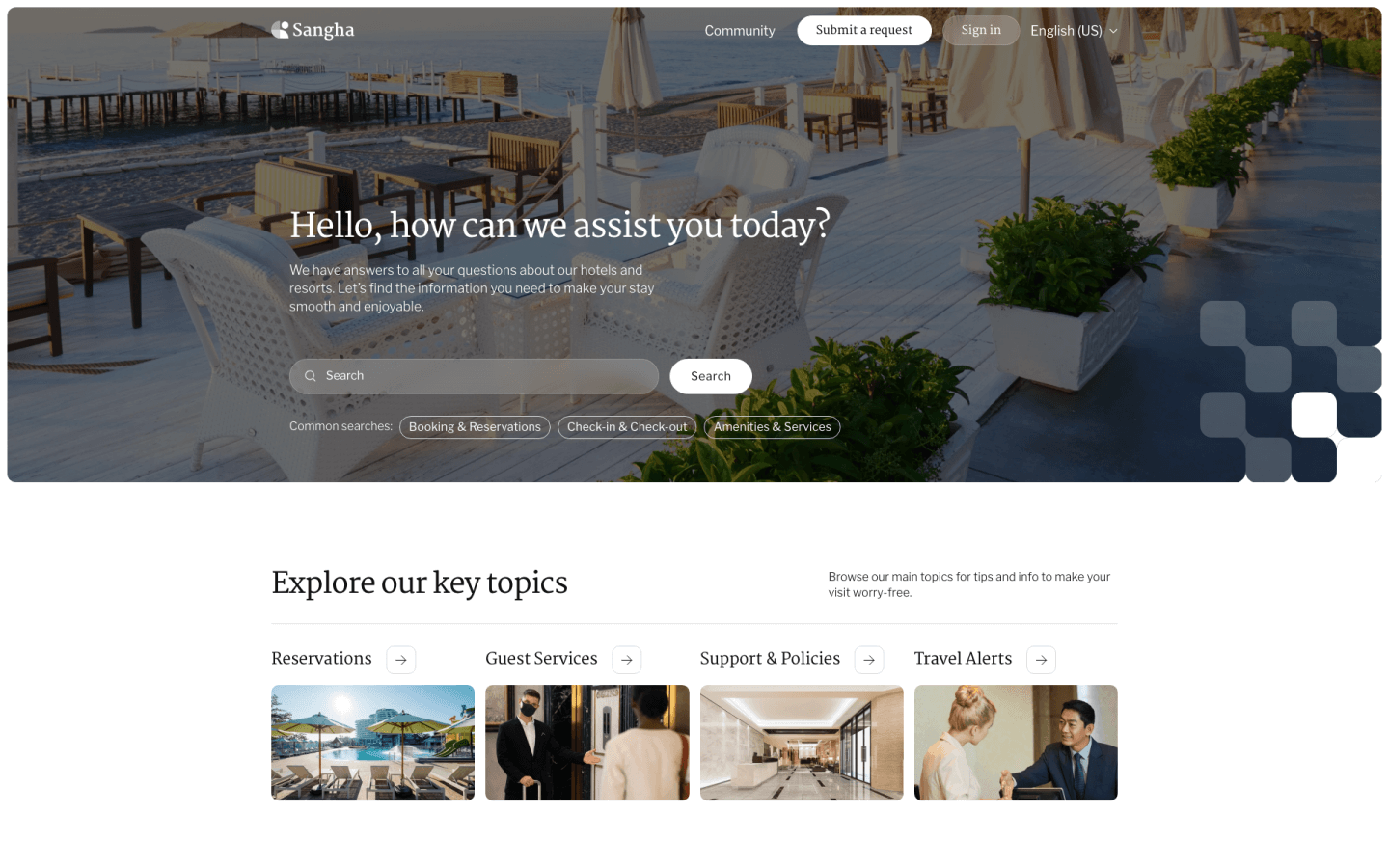 Sangha 128 is a sleek, modern Zendesk theme crafted for Travel & Hospitality brands, ideal for hotels and resorts. Its highly customizable homepage is fully modular—sections can be shown or hidden with simple toggles, allowing you to tailor the layout to your needs. Built on the latest Templating API v4, it offers greater flexibility, faster performance, and advanced design control. With AI Quick Answers, Sangha 128 helps users find instant solutions, improving overall support efficiency. Versatile and easy to adapt, this theme works just as well for any other industry or service portal. No coding required—just a seamless, powerful support experience tailored to your brand.