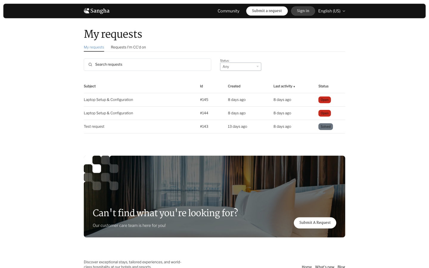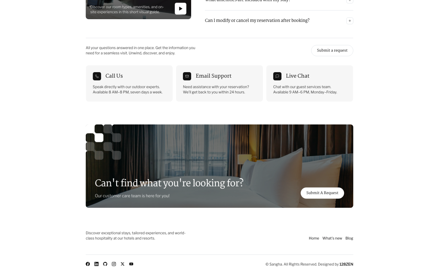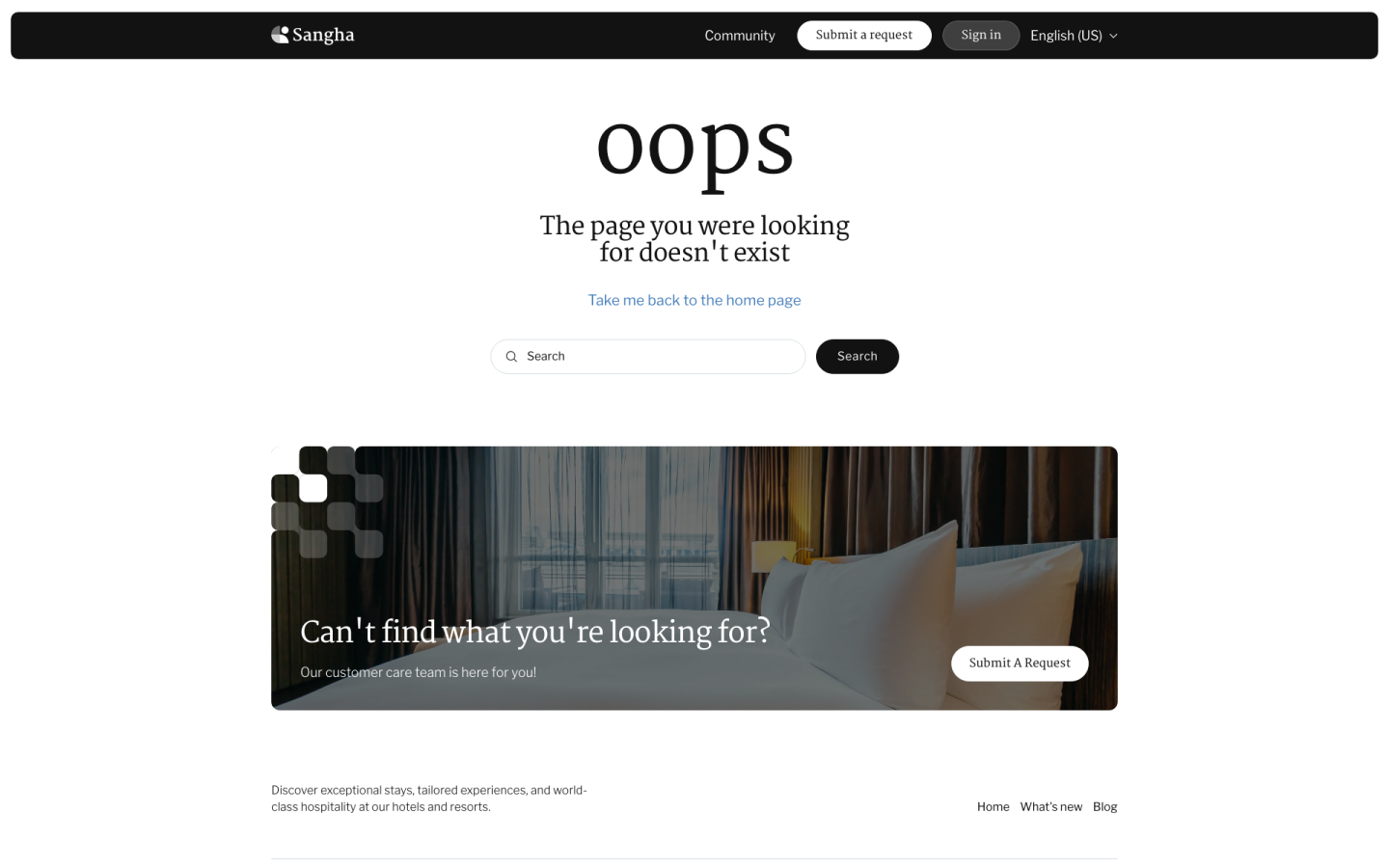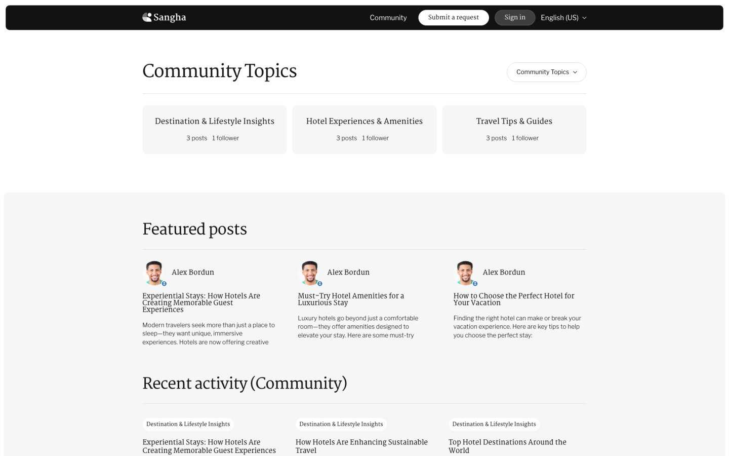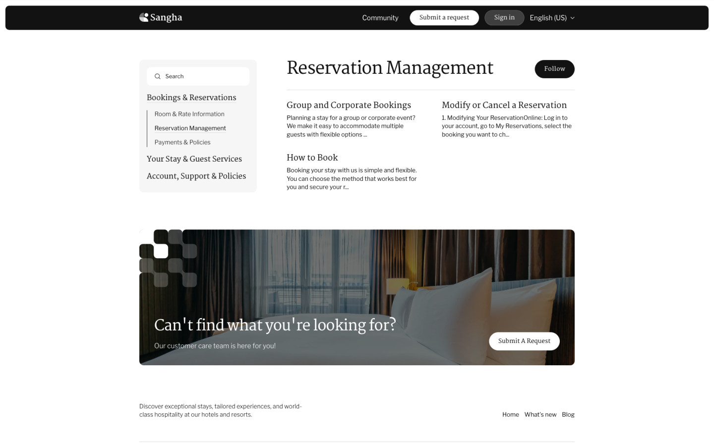 Sangha 128 is a sleek, modern Zendesk theme crafted for Travel & Hospitality brands, ideal for hotels and resorts. Its highly customizable homepage is fully modular—sections can be shown or hidden with simple toggles, allowing you to tailor the layout to your needs. Built on the latest Templating API v4, it offers greater flexibility, faster performance, and advanced design control. With AI Quick Answers, Sangha 128 helps users find instant solutions, improving overall support efficiency. Versatile and easy to adapt, this theme works just as well for any other industry or service portal. No coding required—just a seamless, powerful support experience tailored to your brand.