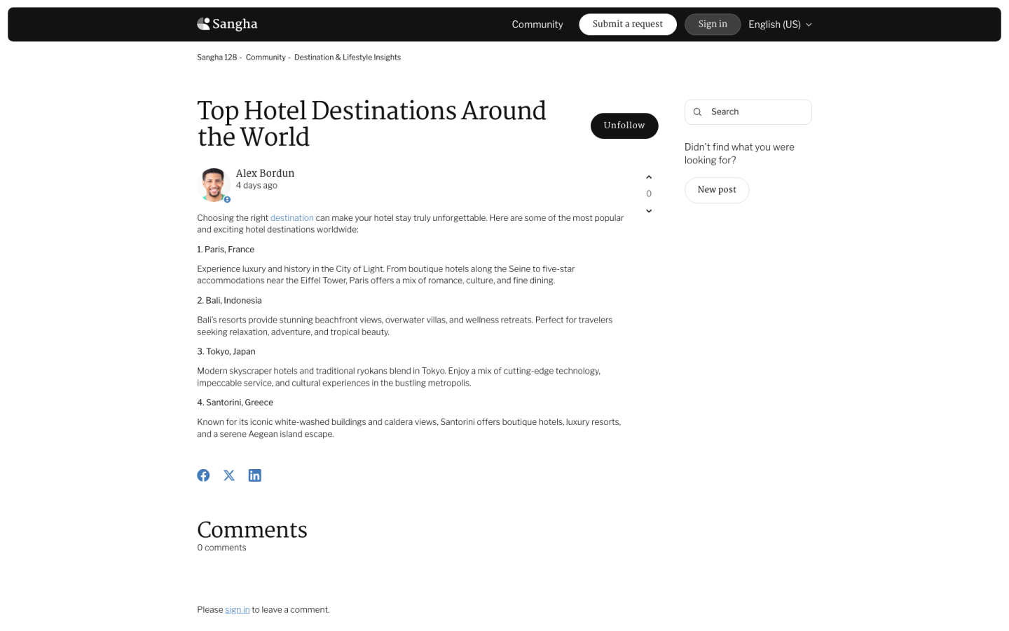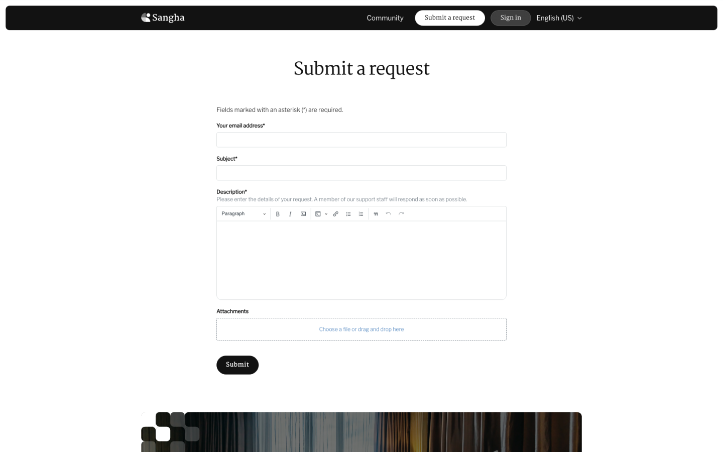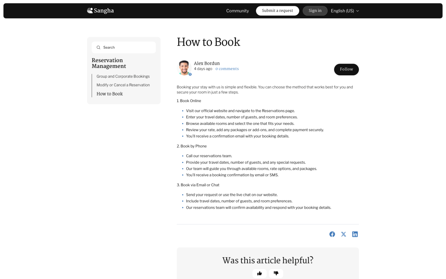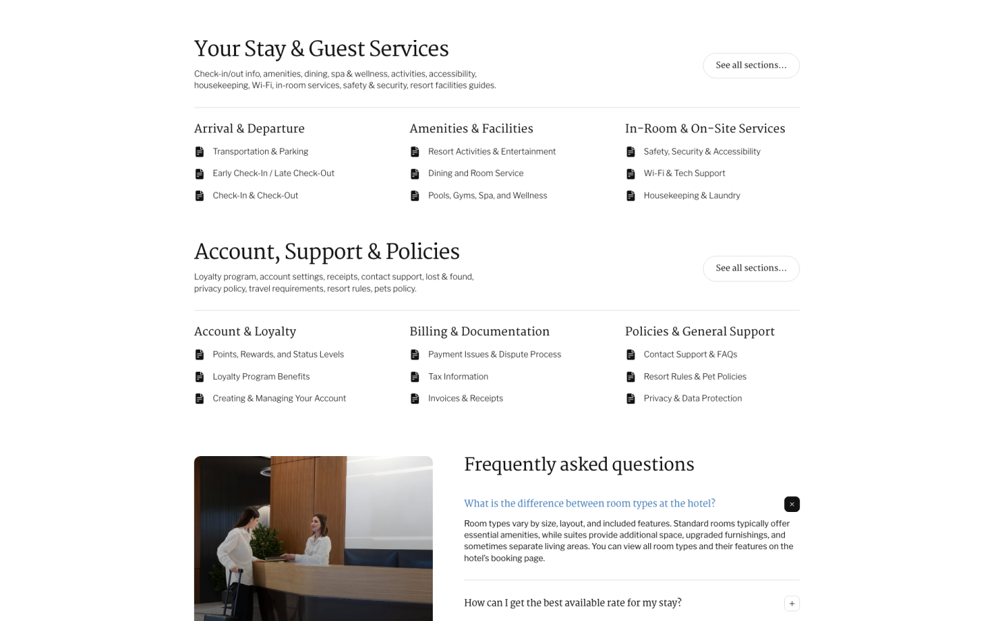 Sangha 128 is a sleek, modern Zendesk theme crafted for Travel & Hospitality brands, ideal for hotels and resorts. Its highly customizable homepage is fully modular—sections can be shown or hidden with simple toggles, allowing you to tailor the layout to your needs. Built on the latest Templating API v4, it offers greater flexibility, faster performance, and advanced design control. With AI Quick Answers, Sangha 128 helps users find instant solutions, improving overall support efficiency. Versatile and easy to adapt, this theme works just as well for any other industry or service portal. No coding required—just a seamless, powerful support experience tailored to your brand.