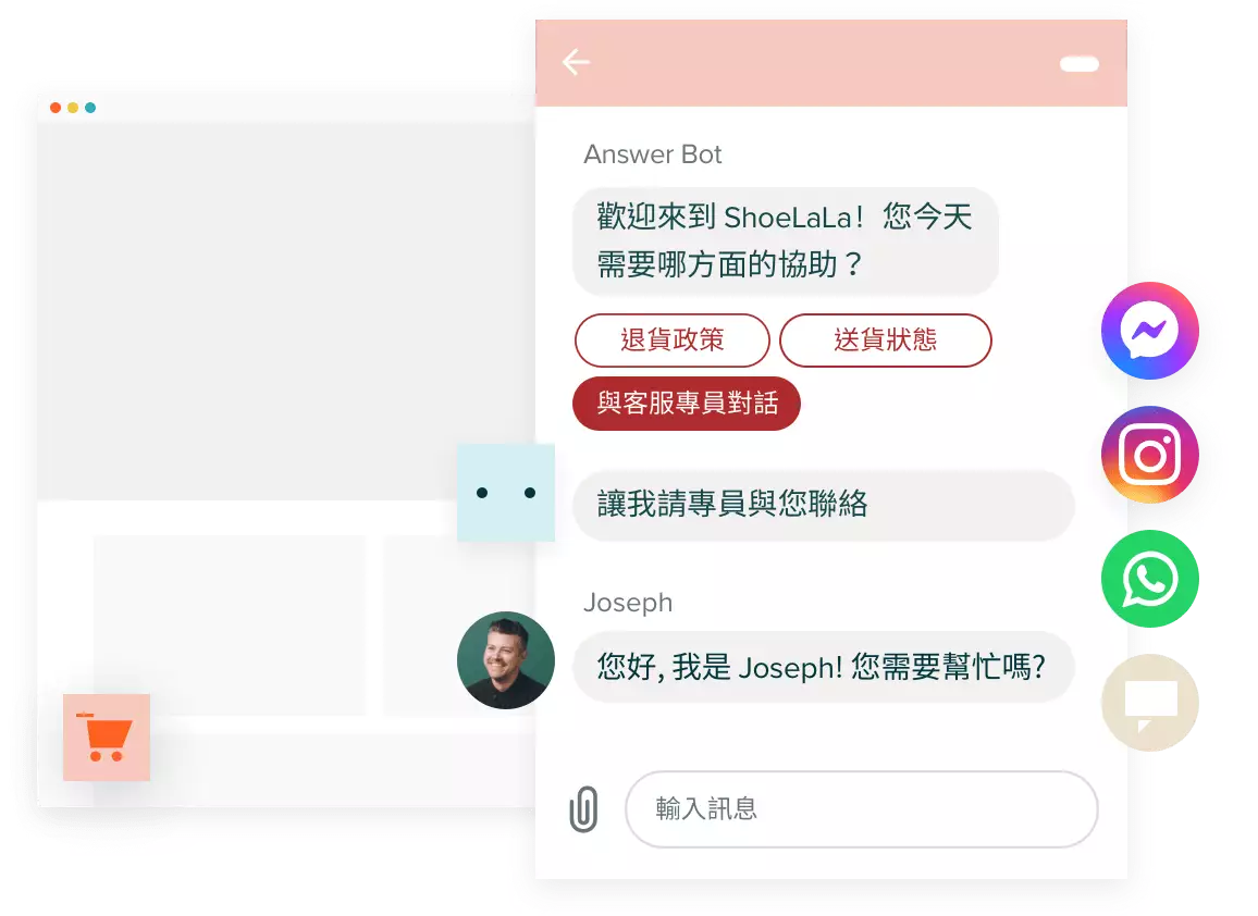只需一次簡易安裝,就能在您所有 Shopify 商店中嵌入並管理品牌傳訊體驗。 將您所有網站、社群媒體和行動裝置管道整合起來,便能隨時隨地順暢提供客戶服務,不必擔心跟不上對話內容。
