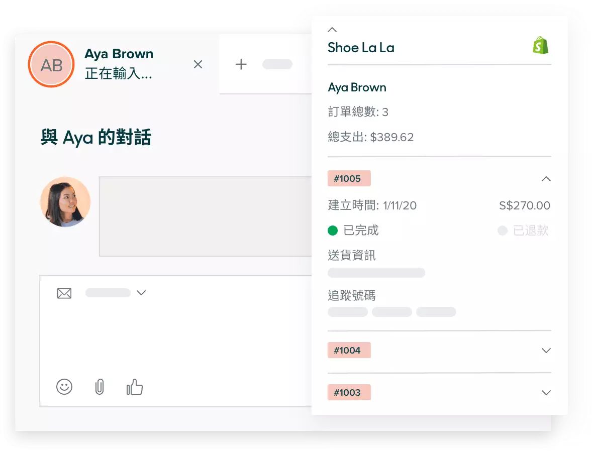當客服專員能夠充分理解每一個問題的背景資訊時,才能提供最佳客戶體驗。 因此,我們與 Shopify 攜手合作,提供立即可用的整合功能,讓您的客服團隊能夠依客戶需求提供支援。