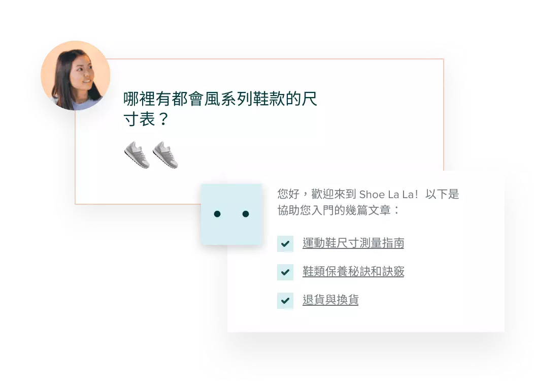運用整合了知識庫的人工智慧 Bot 為客戶提供支援,輕鬆回答退貨政策等常見問題。 如果遇到複雜的詢問內容,我們的 Bot 可以連同所有客戶背景資訊,不著痕跡地將對話轉交真人客服專員。